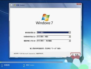1. 进入Windows 7安装界面后,选择安装语言、时间和键盘布局,然后点击“下一步”。